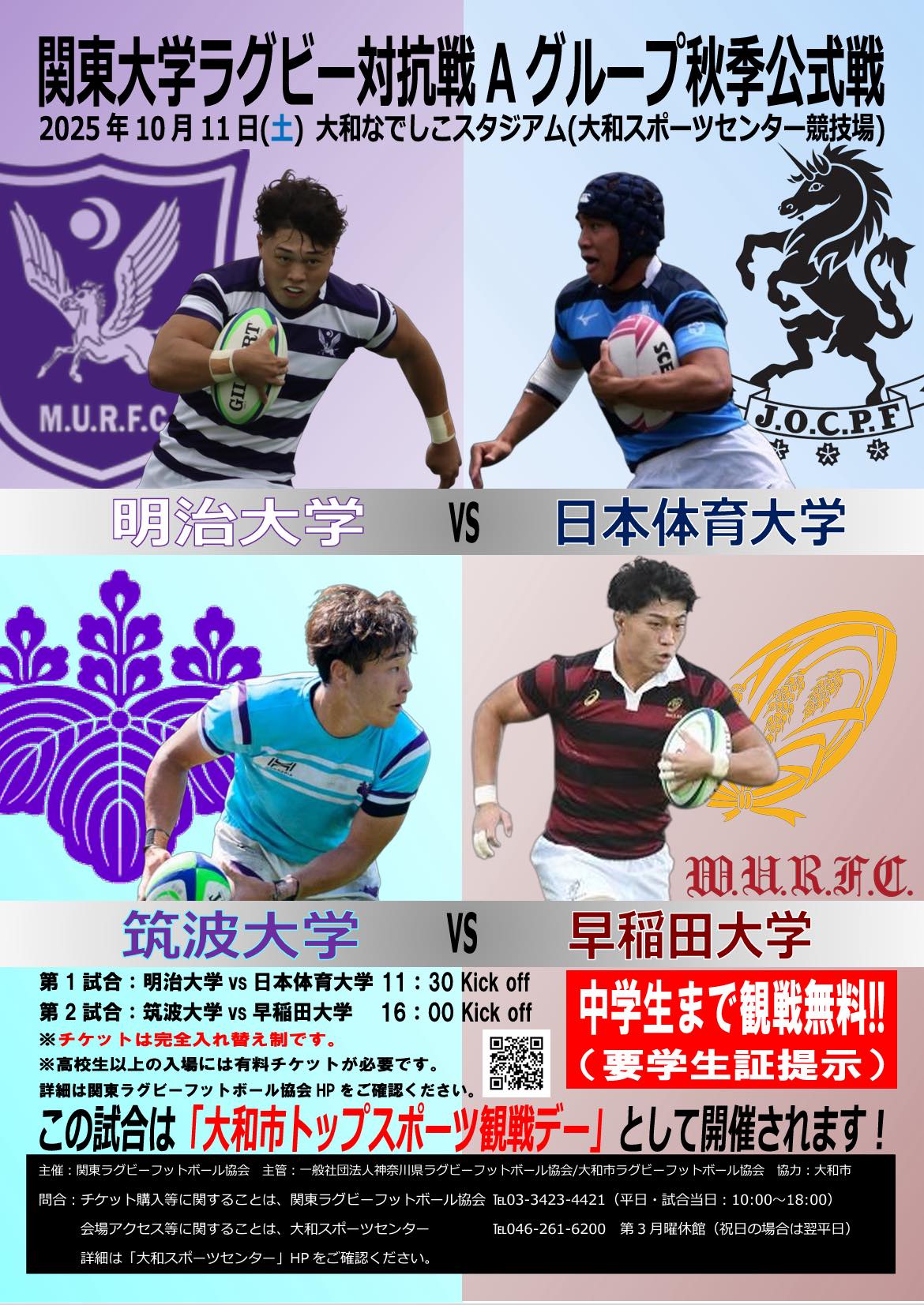 来る10月11日、大和スポーツセンター競技場に於いて、関東大学ラグビー対抗戦A公式戦が開催されます。