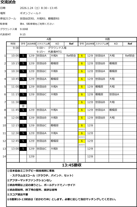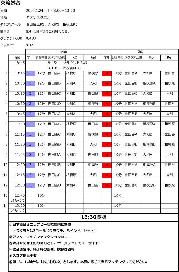 【3~6年】リーグワン前座交流試合[相模原ギオン] 以下の日程にて、ミニラグビーリーグワン前座交流大会の開催が予定されております。 日時:2026/1/24(土)午前中~ ※集合時間等は各担当ヘッドコーチに従って下さい。※以下のスケジュールは現在(1/7)時点でのスケジュールです。 今後追加や変更が入る可能性がございます。 3-4年 5-6年